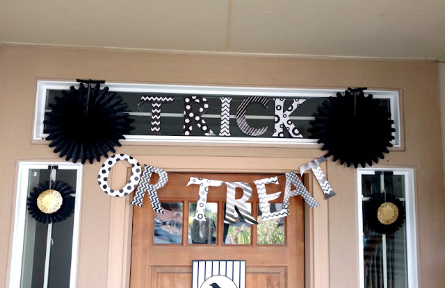 Over the door I hung the Trick or Treat banner. It looks great here, and would be fun to hang off the back of your car at a trunk or treat activity too.