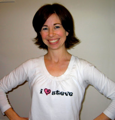 It’s time for a couple of Valentine project flashbacks. This first one should be a treat for you–it never appeared on the blog. I used a freezer paper stencil and fabric paint to make this shirt which I made my Facebook profile pic a couple years ago (and wore while running all my errands on Valentine’s Day)