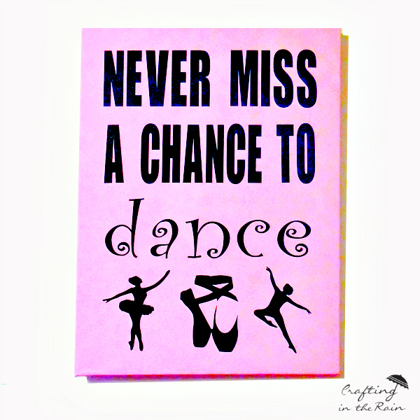 Pink painted canvas with black glitter vinyl. “Never miss a chance to dance” with some cute dance silhouettes at the bottom.