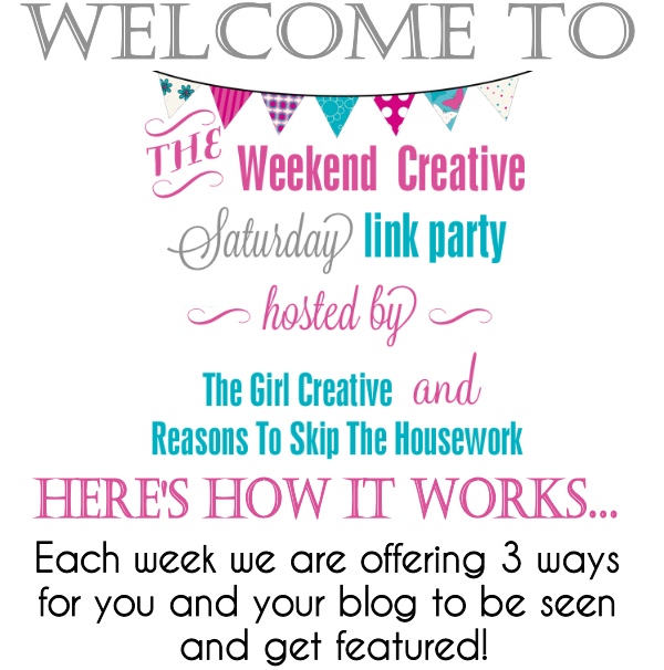 Hey everyone. Hope your weekend is going great so far. I’m happy to be a guest host of Weekend Creative this evening with The Girl Creative and Reasons to Skip the Housework. If you don’t already read their blogs, go check them out!