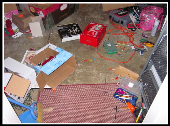 This is right at the door from the inside of the house, and it looked like this for probably two weeks. Yep, for two weeks, every time we went in or out of the garage we were stepping in or over spilled crayons markers and pencils. Why is it so hard to just do a job like that sometimes? I don’t know. But I finally decided to do use my 27-thing trick, and look at the difference! I counted all the crayons as one “thing”, and it still only took about 3 minutes to clean up this whole little spot. Now we no longer risk sprained ankles or death as we go in and out of this door.